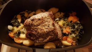 Nach zwei Stunden ist der Braten fertig und schön saftig. Die Beilagen – Kartoffeln und das Gemüse – ebenfalls