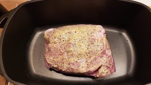 Ca ein Kilo Schweinenacken-Braten mit Senf bestreichen, mit Sale und Pfeffer würzen und in Schmortopf geben.