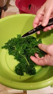 2. Grünkohl klein schneiden, die festeren Stengel entfernen, die kleineren kann man dranlassen.